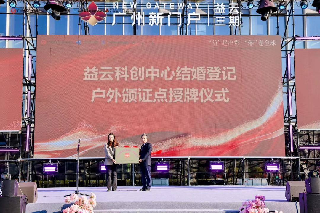 当天,益云科创中心被正式授牌为白云区结婚登记户外颁证点。据了解,近年来,白云区民政局在白云区委、区政府的正确领导下,始终坚持“重登记、强责任、崇节俭”的婚俗理念,积极探索有白云特色的婚姻登记服务模式,目前已建立了4个结婚登记户外颁证点,旨在丰富新人结婚登记场景的同时,为爱情减负、给幸福加分,摒弃铺张浪费,让更多年轻人更轻松地办婚礼、更愉快地在白云安家。