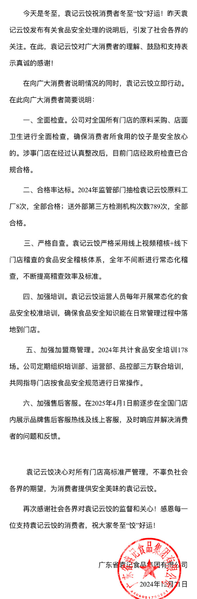 12月21日晚间,袁记云饺再就北京海淀区六道口店“吃出蚯蚓”发布说明称,涉事门店在经过认真整改后,目前门店经政府检查已合规合格。袁记云饺表示,公司对全国所有门店的原料采购、店面卫生进行全面检查,并加强售后客服,在2025年4月1日前逐步在全国门店内展示品牌售后客服热线及线上客服,及时响应并解决消费者的问题和反馈。