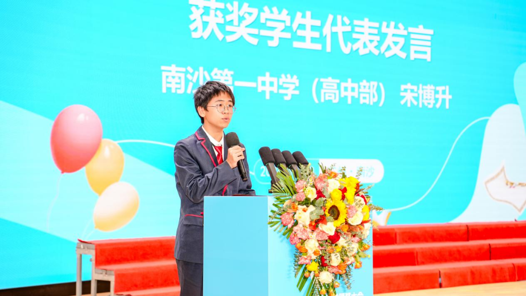 广州市南沙第一中学宋博升同学作为获奖学生代表上台作了真切发言,生动诠释了未来属于青年,希望寄予青年。“在过去的一年里,我一直以积极向上的态度,努力在思想、学习等各个方面不断提升自己,希望能够成为一个全面发展的人。面对课业压力,我未曾放弃,反而正是因为这份压力,激发了我内心深处的斗志与求知欲,让我更加努力学习,积极提升自我。”