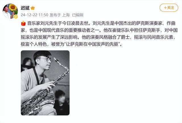 据乐队经纪人、音乐博主迟斌消息,中国萨克斯演奏家、作曲家、崔健乐队萨克斯手刘元于12月22日凌晨离世。