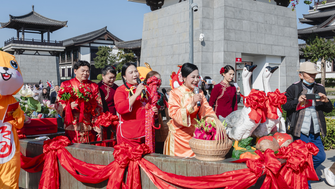 紧接着,南沙水乡婚俗情景剧为观众带来了别具一格的传统婚礼体验。身着传统服饰的南沙水乡婚俗市级代表性传承人黎月欢作为大妗姐,带领观众重返旧时光,生动重现了花艇迎亲、跨火盆、大嫂斟茶等充满浓厚地方色彩的水乡婚礼习俗。在过去的婚礼中,大妗姐常被誉为新娘子的“守护神”,能够给新人带来吉祥和幸福。同时,大妗姐还进行了现场说媒并派发喜糖,与观众进行亲密互动。这一环节瞬间点燃了现场氛围,吸引了众多青年男女勇敢地踏上舞台,大方地分享自己对爱情的憧憬与追求,为活动增添了一份温馨与浪漫。