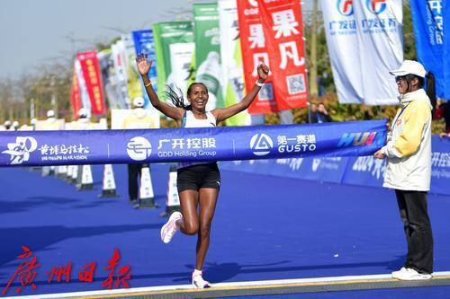 全马女子冠军冲线现场。