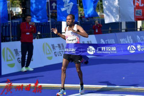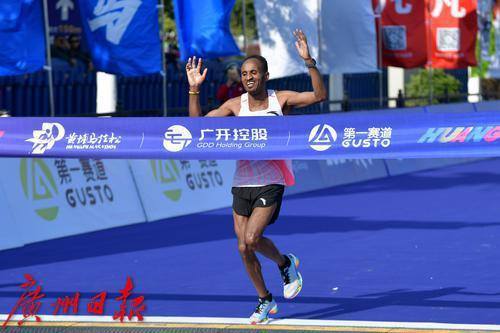 全马男子冠军冲线现场。