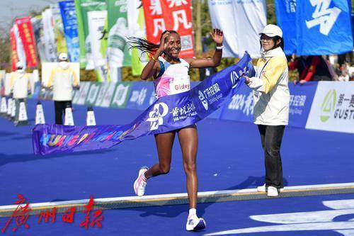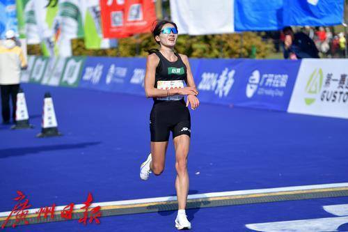国内女子冠军跑过终点。
