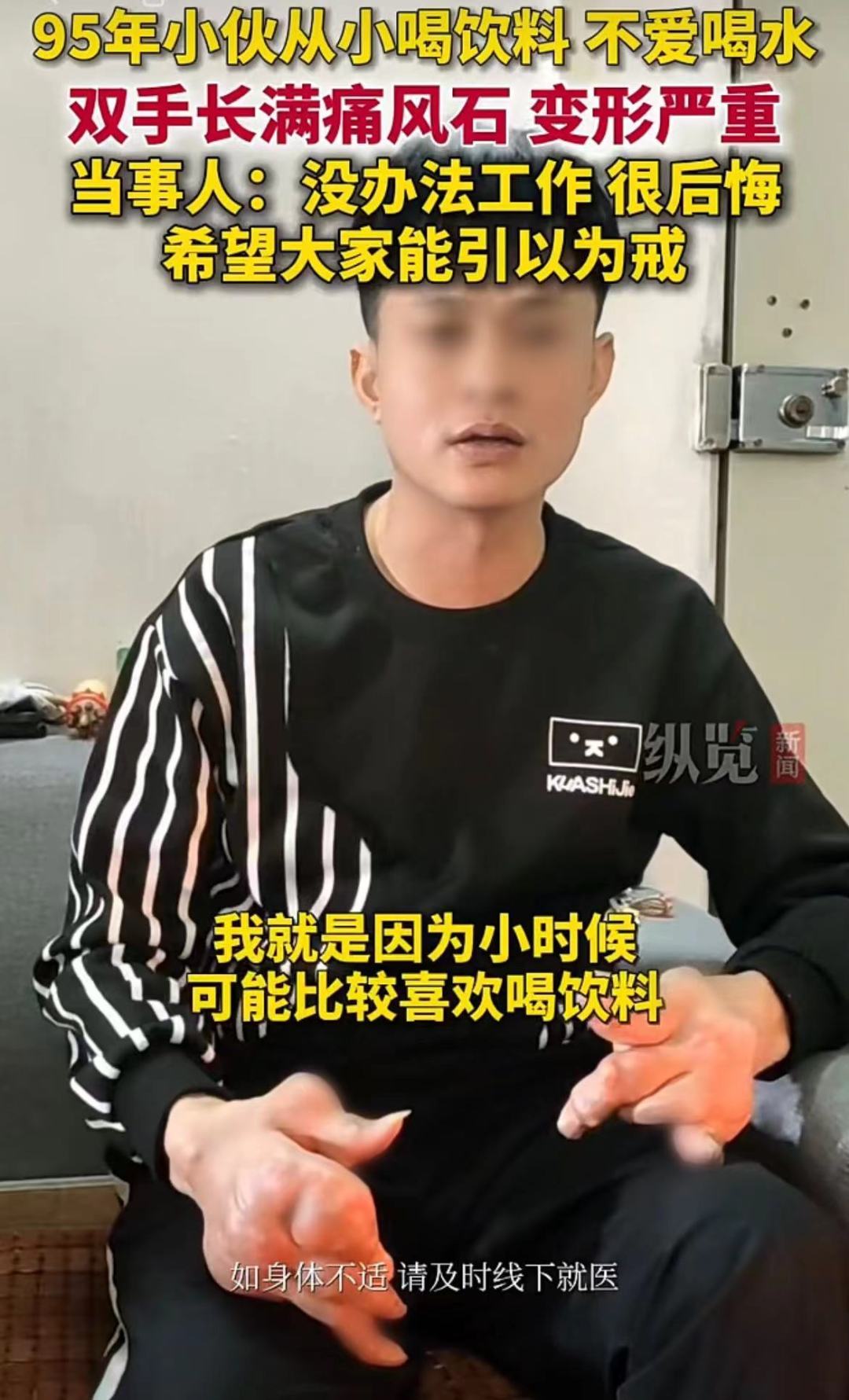 蓝先生称,自己从小就爱喝饮料,经常一天喝三四瓶,直到4年前才戒掉饮料“瘾”,长大后也爱饮酒熬夜,长此以往发展成痛风,发作时必须得打止痛针,如今双手布满“痛风石”。