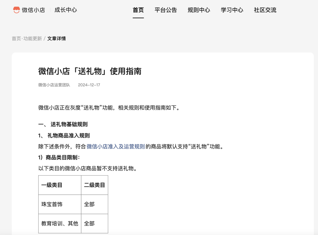 据悉,此次微信小店“送礼物”功能并非全面开放给所有商品。目前,除珠宝、教育培训两大类目外,其他类目原价不超过1万元的商品,都将默认支持“送礼物”功能。赠送方每次只能给一位朋友赠送一件商品,赠送后不支持转赠给其他朋友。而且一旦送出礼物后,不论朋友是否收下礼物,赠送方在24小时内都无法主动取消赠送或取消订单。若朋友超过24小时未收下礼物,订单将自动取消并退款给赠送方。