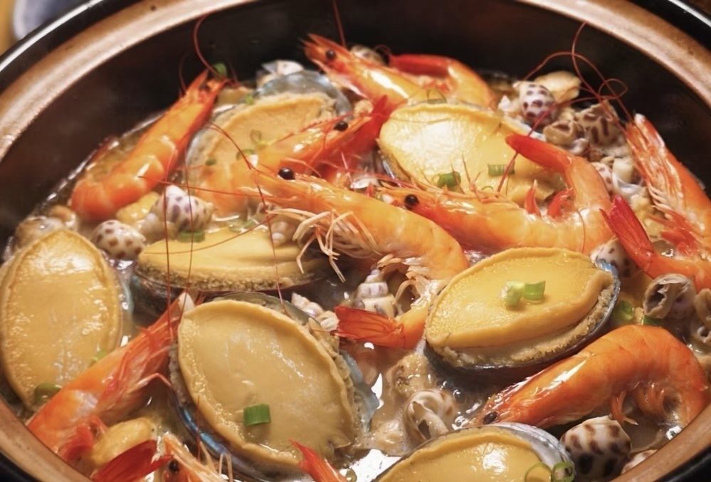 砂锅揭开盖子的一刹那,金黄色的汤汁氤氲起浓郁的香味,鸡的油脂香气与海鲜的鲜味接踵而至,黄澄澄的鸡肉外皮紧致内里多汁;金灿灿的鲍鱼个大味美,滑嫩弹牙,佐以酱油及店家特制的姜蓉、辣椒酱,则更能激发出食材咸香鲜美的口感。食罢主菜后,鲜甜汤浓的汤汁更不容浪费,打边炉涮蔬菜,或是煮面、捞饭,都不失为一道人间至味。
