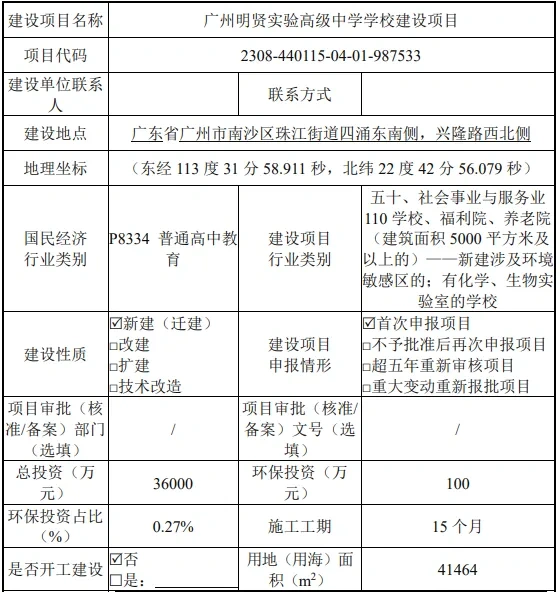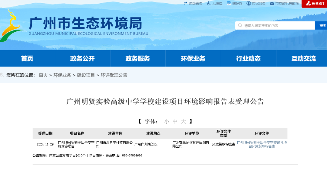 11月29日,广州市生态环境局官网发布了《广州明贤实验高级中学学校建设项目环境影响报告表受理公告》(下称《环评公告》)。