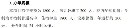 本项目招生规模为1800人,预计教职工200人,校内配套食宿;学制为寄宿制普通高中,住宿学生1800人;设寒暑假,年运行约200天,开学时间24小时运作。