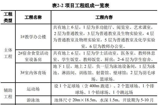 项目主要建筑包括1栋教学办公楼、1栋食堂宿舍楼、1栋体育馆等。