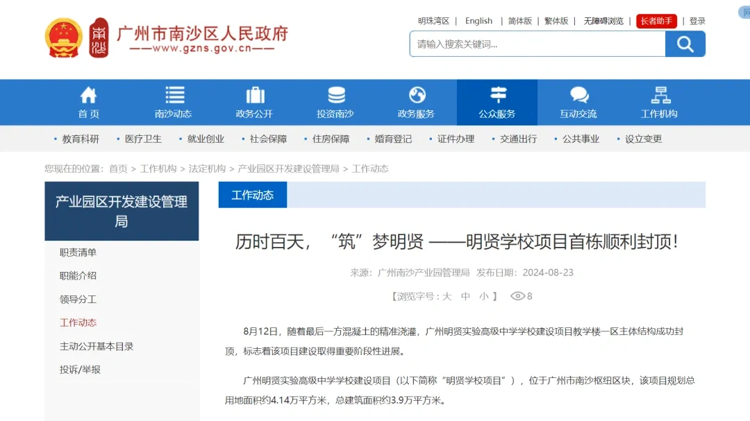 记者从南沙区政府官网了解到,8月12日,广州明贤实验高级中学学校建设项目教学楼一区主体结构成功封顶,标志着该项目建设取得重要阶段性进展。