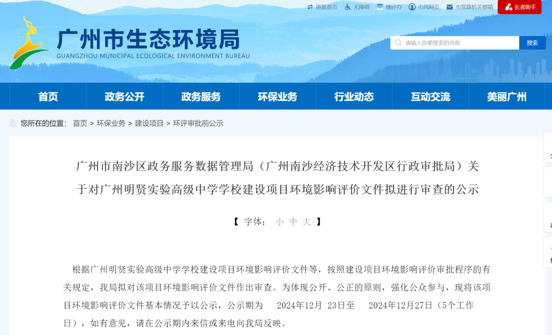 近日,广州市生态环境局网站发布了《关于对广州明贤实验高级中学学校建设项目环境影响评价文件拟进行审查的公示》(下称“《公示》”)。