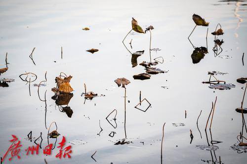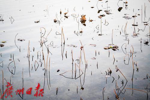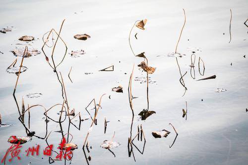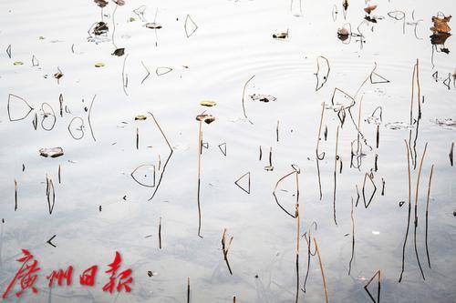 夏日盛开的荷花,在秋冬枯败凋零之后,也别有一番韵味。在越秀区的东山湖公园,湖面有一片残荷,只见残荷的枝干不再挺拔,或孤零零地竖着光杆,或低垂于水面,或弯折着身躯,看似荒芜,但在冬日宁静的湖面上,却倒映成一条条线条、一个个抽象符号,凝神细看,仿佛一幅简笔画,颇具趣味。