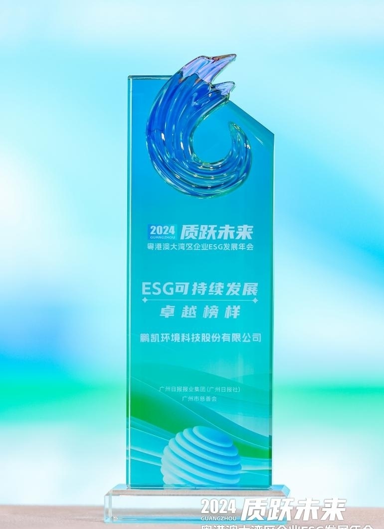 近日,由广州日报报业集团主办的“质跃未来”2024 粤港澳大湾区企业ESG 发展峰会在广州举行,业界专家学者、企业机构代表齐聚,共同探讨新质生产力、ESG发展机遇、企业实践等议题,为高质量发展注入“湾区动能”。活动现场,鹏凯环境科技股份有限公司(以下简称“鹏凯环境”)凭借水环境治理绿色发展的探索与成果荣获“ESG可持续发展卓越榜样”奖。