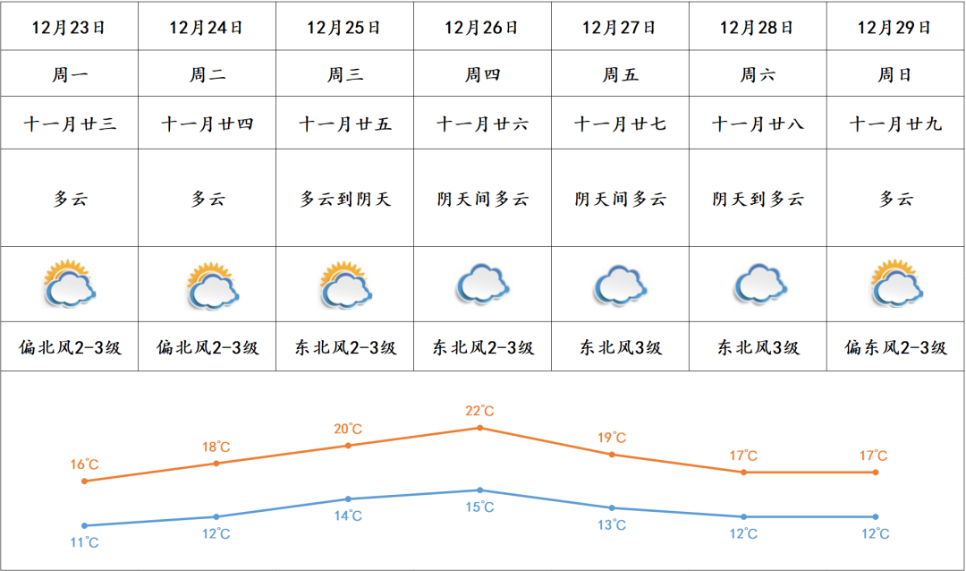 与上周的晴朗干燥不同,南沙本周的天气关键词为多云。据南沙区气象台预计,未来几日云量增多,24日起气温回升,最高气温逐渐上升至22℃;展望27日—29日受新一股冷空气影响,日均气温将下降3—4℃。