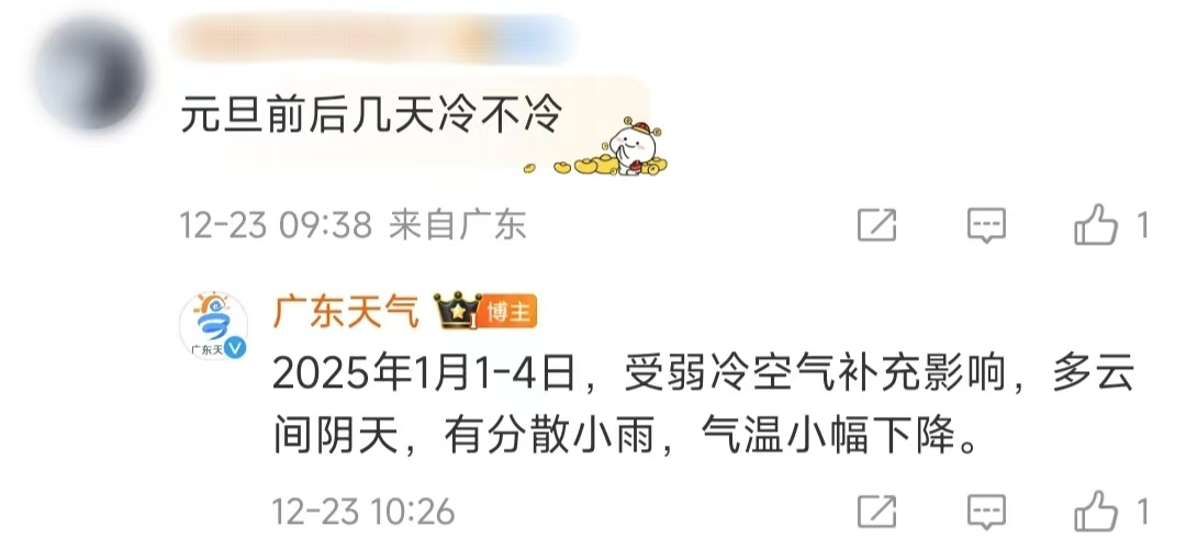 答:据@广东天气“剧透”,2025年1月1日—4日,受弱冷空气补充影响,多云间阴天,有分散小雨,气温小幅下降,有出行计划的市民朋友请继续关注最新的预报信息。