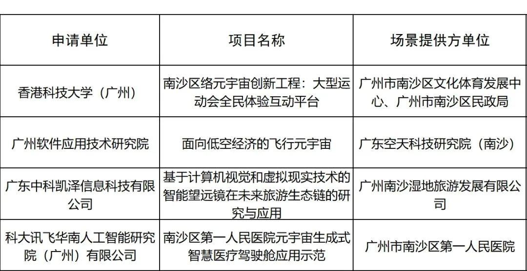 近日,根据《广州市南沙区科技计划项目管理办法》(穗南科规字〔2023〕1号)有关规定,南沙区科学技术局公示2024年南沙区元宇宙技术应用示范项目立项结果(见下图)。