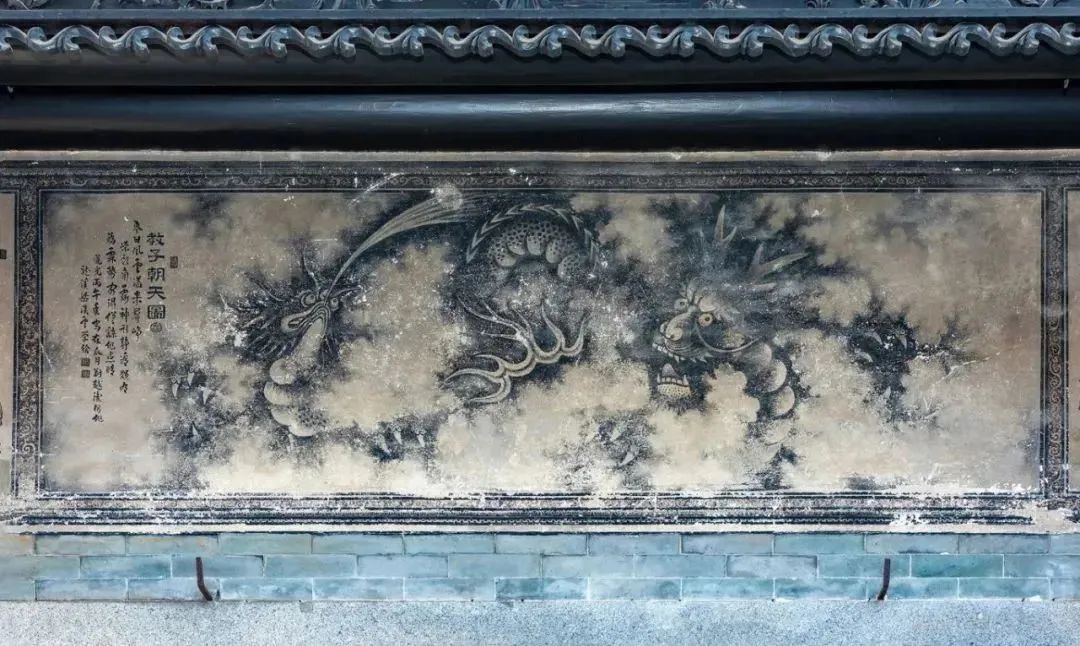 黄阁镇辅党麦公祠门上的《教子朝天图》,高约一米、长近三米,由清代道光年间的梁汉云大师绘制,描绘了翔龙穿云的动人场景。老龙威严而庄重,小龙活泼而灵动,它们在云雾间穿梭,仿佛在诉说着一个关于传承与希望的永恒主题。而那轮洁白的太阳,如同点睛之笔,为整幅画面增添了几分神圣与庄严。