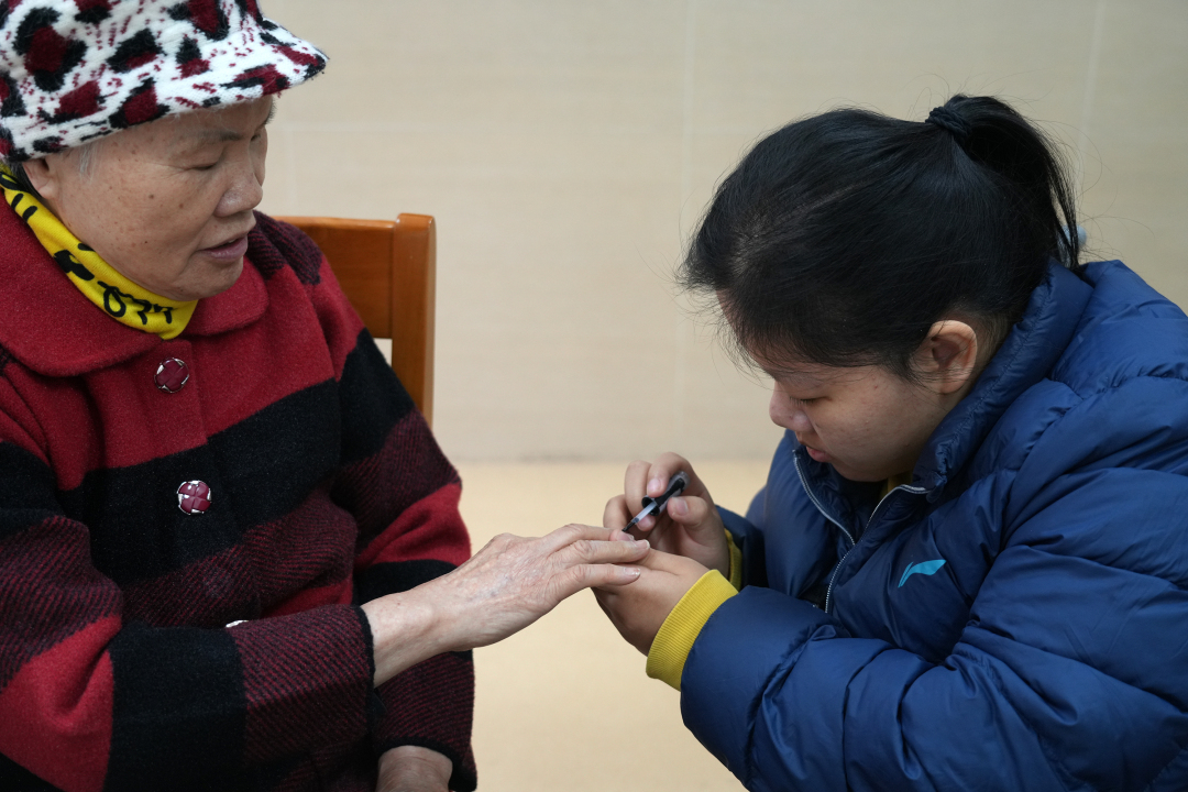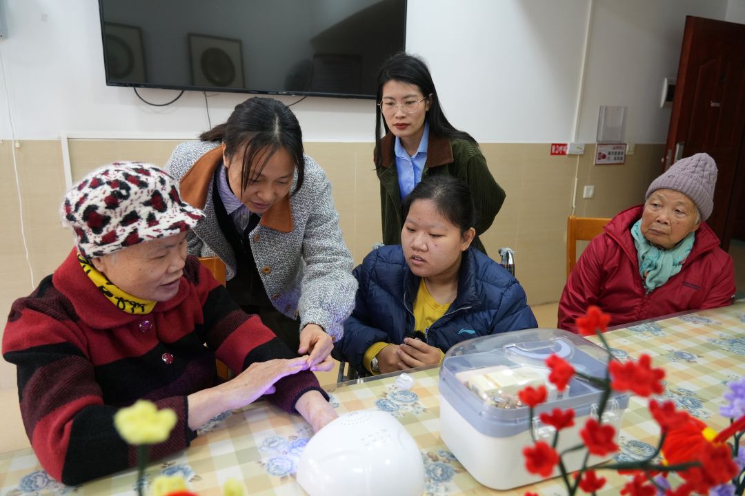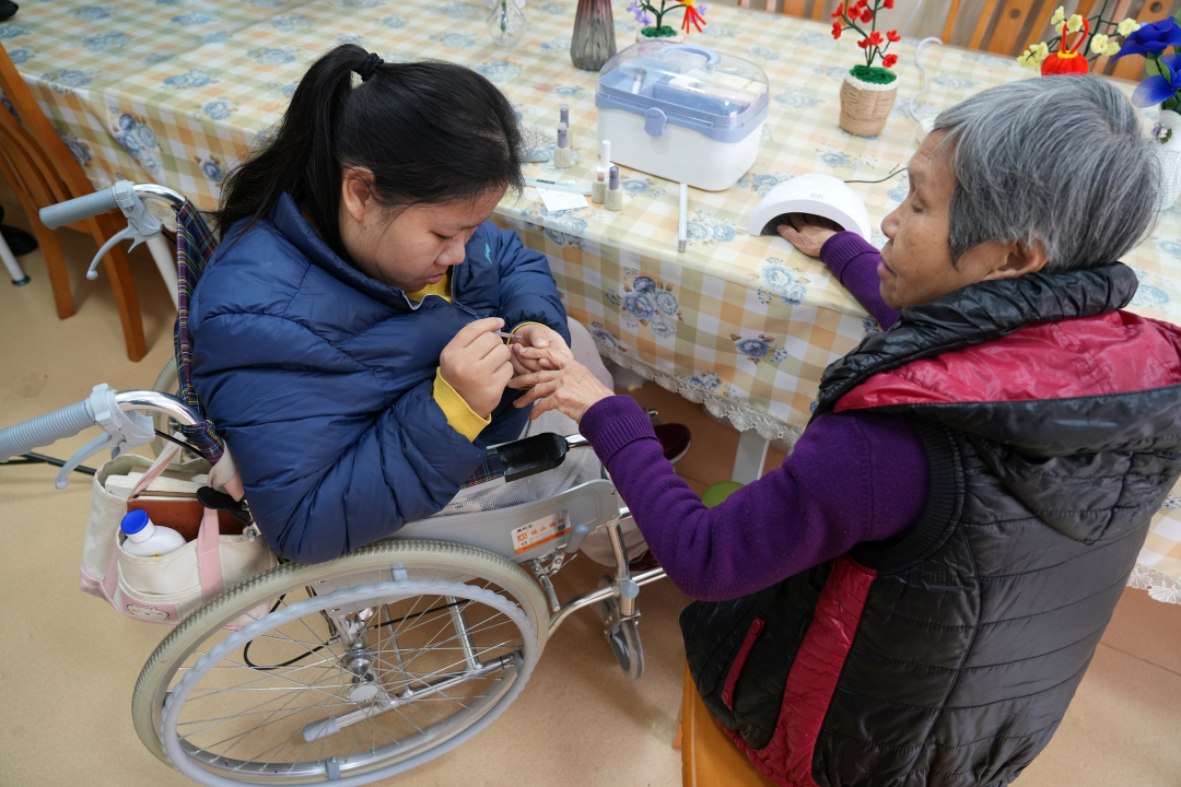 刻苦学习的技能,需要一个展现的舞台。今年重阳节,桃苑福利中心举行敬老活动,为了让莹莹可以在实践中锤炼本领、增强生活信心,中心工作人员鼓励莹莹在现场开设了一个美甲摊位,化身“美的使者”,用一双巧手长者们带去了专属美甲服务。