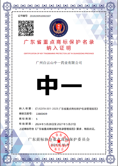 白云山中一药业将商标品牌的培育和保护作为企业发展的核心战略,相继培育发展了以“中一牌”“中一红棉花”等核心品牌为基础的系列商标。2020年,白云山中一药业的“中一牌”和“中一红棉花”2件商标首次成功纳入《广东省重点商标保护名录》。