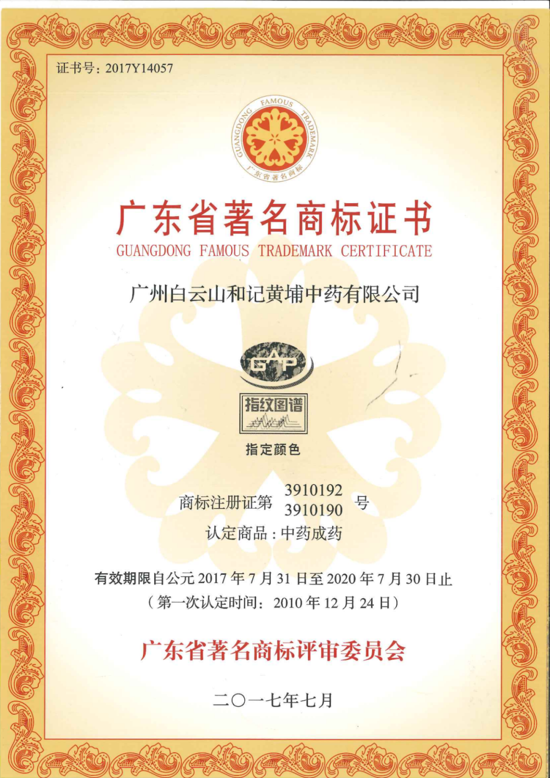 白云山和黄一直以来高度重视商标品牌的管理、维护和培育工作,过去十多年里重点培育了有“GAP”和“指纹图谱”商标,两件商标2006年注册完成,于2009年就被认定为广州市著名商标,2010年更被认定为广东省著名商标,在行业内也一直都具有较高的认可度和知名度。