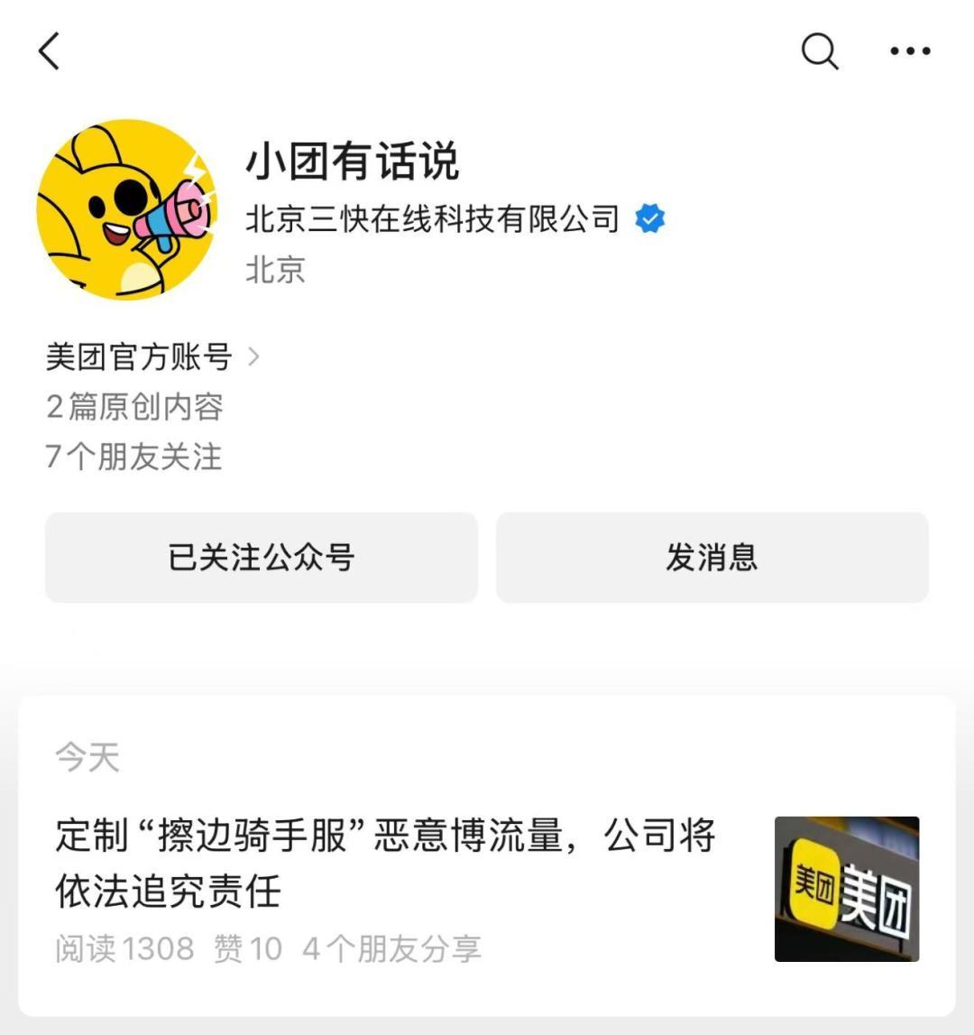 12月24日,美团官方账号“小团有话说”发布消息称,近日,多个社交平台上“外卖骑手身着‘点男模’等字样的工服送单”的图片、视频被广泛传播,引发社会关注。经公司核实,上述“擦边”骑手工服,均为电商平台不法商家私下定制的服装,并非美团骑手App商城中所售正规骑手服装,也不符合美团对于骑手的相关着装要求。
