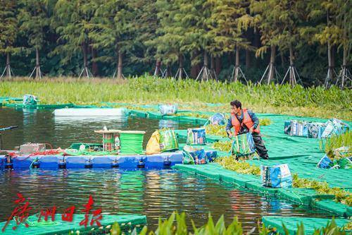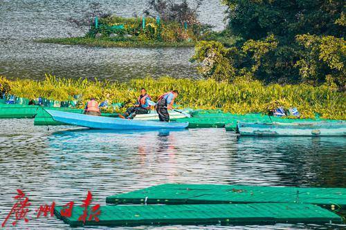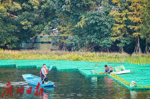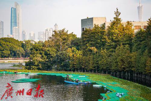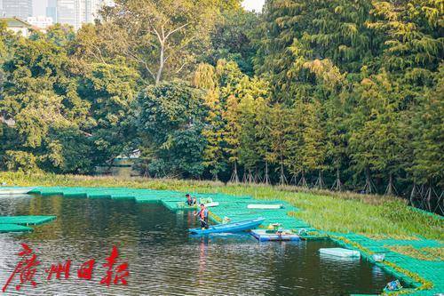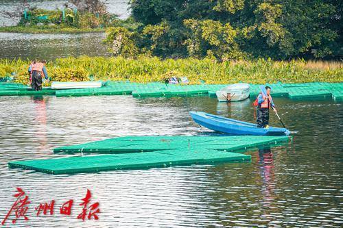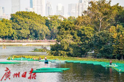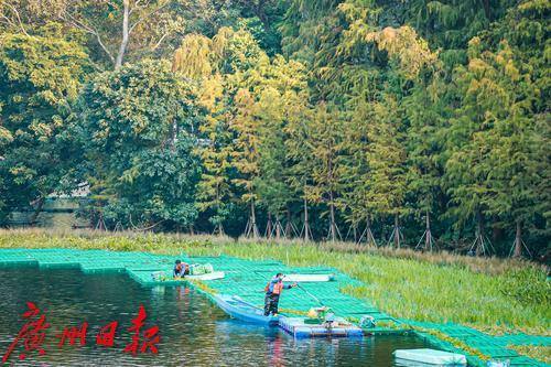 最近,在东山湖公园南侧的落羽杉树丛下,远远地能看到几位工人在水上“漂”着,走近一看,原来他们是踩着一片搭建在水上的浮台,在进行种草工作。据悉,这些工人种植水草,是为了东山湖的小微湿地保护与提升工程,该工程需要在这片落羽杉树下构建浮动湿地生境、歇鸟木桩,并种植水生植物。只见工人们熟练地“漂着”走在浮台上,每一脚都会有一波水花溅起,他们把水上植物种在水中,一片“绿草”浮动湿地便在水上、树下渐渐铺展开来。据该工程告示牌显示,施工期为12月至明年2月,这意味着到明年春天,在广州城央的东山湖,又将多出一片湖、草、树、鸟和谐相生的美丽湿地景观供人观赏。