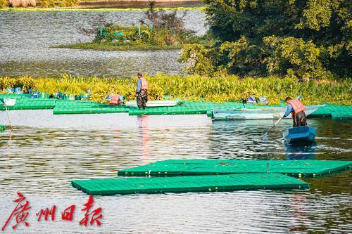 工人有的在浮台上,有的驾驶小船,熟练地进行水上种植作业。