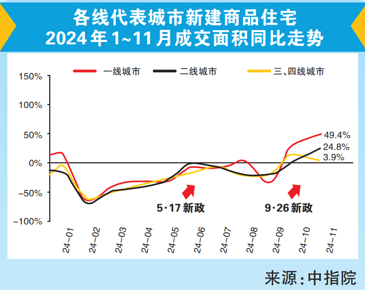 2024年的楼市,呈现出政策红利释放之下的回暖行情。从全年情况来看,根据国家统计局数据,2024年1~11月,全国商品住宅销售额的同比降幅连续7个月收窄。中指院数据显示,其重点监控的百城新房销售面积自10月开始同比转增,结束16连跌。11月重点100城新建商品住宅成交面积环比增长3%,同比增长约20%,较10月增幅扩大10个百分点,新房销售进一步改善。其中,又以一线城市的改善尤为明显。以广州为例,10月、11月的成交面积分别达到112.04万平方米和90.31万平方米,创出年内的第一和第二成交高峰。
