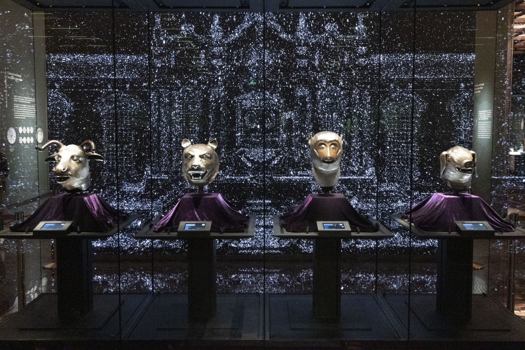 在一眾展品中,最受歡迎的當屬圓明園十二生肖獸首銅像中的猴首、牛首、虎首和豬首這四尊國家一級文物。據資料記載,十二生肖獸首銅像原為清代圓明園長春園西洋樓建築群海晏堂外獸首噴泉(也稱「水力鍾」)的主要構件。1860年英法聯軍侵入北京,圓明園慘遭劫掠並遭焚毀,十二生肖獸首銅像及其他無數珍寶流失海外。直至20世紀後期,散失了百餘年的獸首才陸續重現。十二尊獸首結合了中國傳統審美和西方藝術特色,參觀者可近距離探究其表面的紋理——動物的毛髮和皮膚的褶皺清晰可見,做工極為精細。目前展出的四尊獸首銅像皆為原件,到明年1月中旬或一月底將改用複製品。