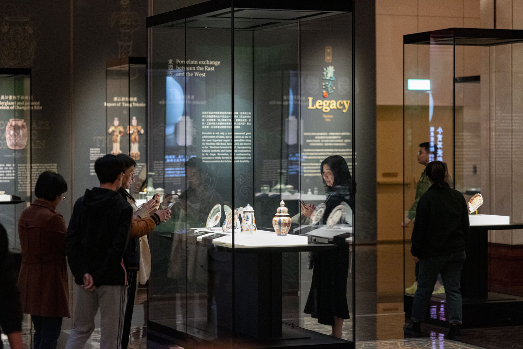 此外,文物與科技的結合也是本次展覽的一大亮點:博物館內利用OLED顯示屏、AI互動裝置等科技元素設置了不少互動環節,例如通過屏幕敲打「明清銅鼓」聆聽樂器音效,撥弄海洋附着物模擬「元青花鳳穿花卉紋玉壺春瓶」出水過程等,讓參觀者得以與文物「對話」,極具趣味性。