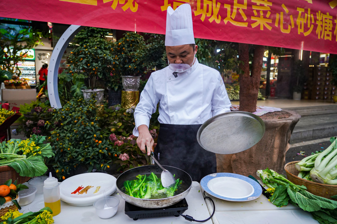 现场展示厨艺的厨师告诉记者,烹饪迟菜心非常简单,一棵菜心不用切断,从中心一分为二,只需要下锅在沸水中煮上1-2分钟,再配上姜丝、辣椒丝和少许食用油浇汁,就可以食用了。食材的清甜、爽脆让每位食客都难以忘怀。