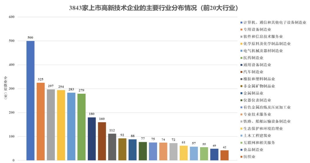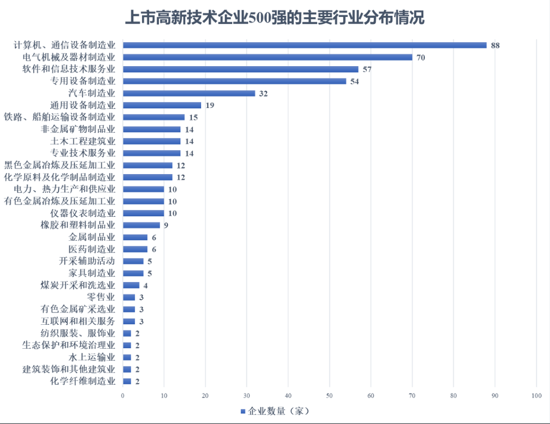 从行业分布来看,制造业企业数量较多。其中,计算机、通信和其他电子设备制造业(500家)是我国第一大主导产业,高新技术上市企业数量位列第一,其次是专用设备制造业(325家)、软件和信息技术服务业(297家)、化学原料及化学制品制造业(294家)、电气机械及器材制造业(283家)和医药制造业(279家),六大行业的企业数量占比超过一半。