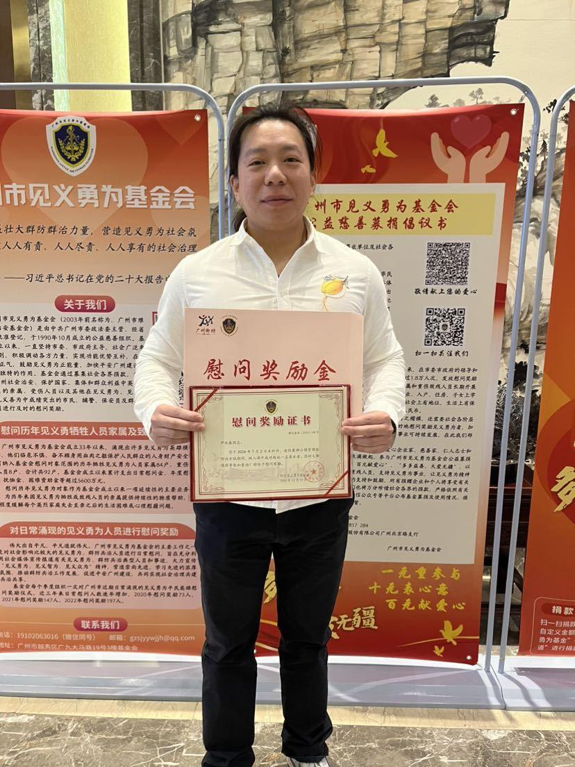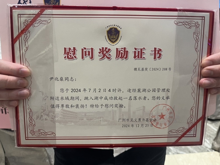 凌晨时分,眼见有人掉落麓湖,途经事发地的广州市民尹兆燊没有选择漠视离开,而是奋勇跳进了麓湖中展开紧急施救。因为这一见义勇为之举,今日,广州市见义勇为基金会专门为尹兆燊颁发了慰问奖励证书,并送上了慰问奖励金。