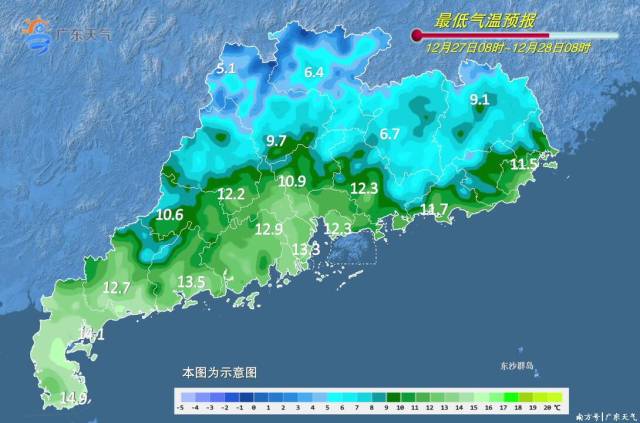 28日转槽后的西北气流控制,我省的天空状况转好,28-29日我省大部分地区气温下降3~5℃。受晴空辐射影响,29日早晨达到过程最低气温,粤北和珠三角北部3~5℃,广州8℃左右。