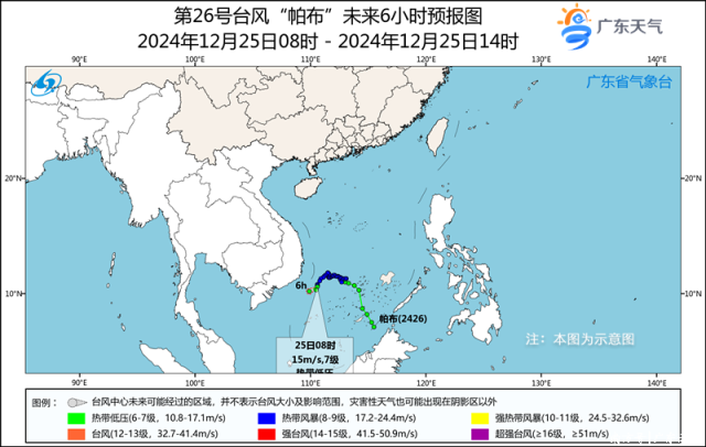 预计,“帕布”将以每小时15公里左右的速度向西偏南方向移动,强度继续减弱,将于25日(今天)白天在南海西南部海面逐渐减弱消散。对我省陆地无直接影响。