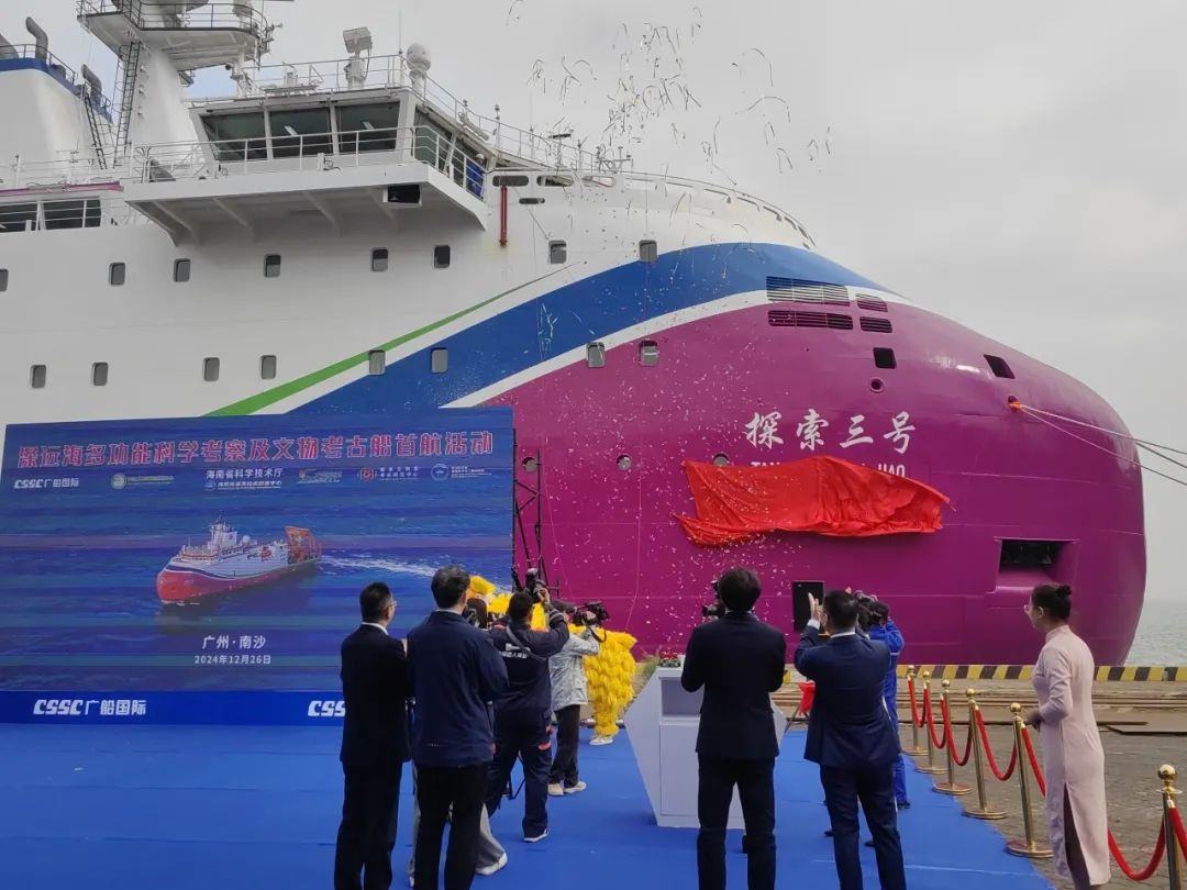 12月26日,由中国船舶集团广船国际建造的深远海多功能科学考察及文物考古船“探索三号”在南沙交付启航。
