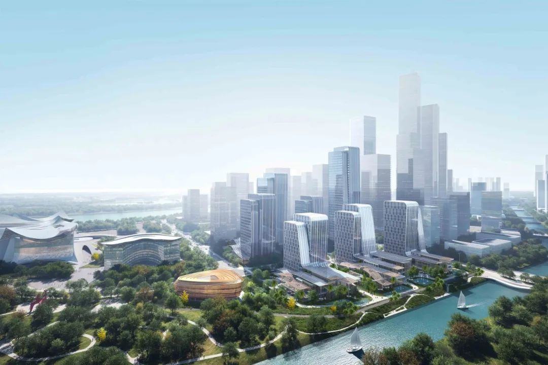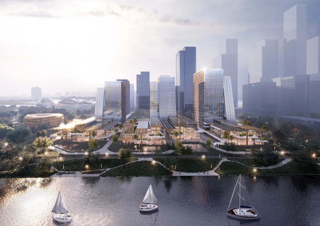 园区整体以“东方指蕴,碧海澄金”为设计理念,整体造型融入岭南建筑特色,顺应南沙“山、江、海、田、城”独特城市空间布局,与城市天际线相呼应。
