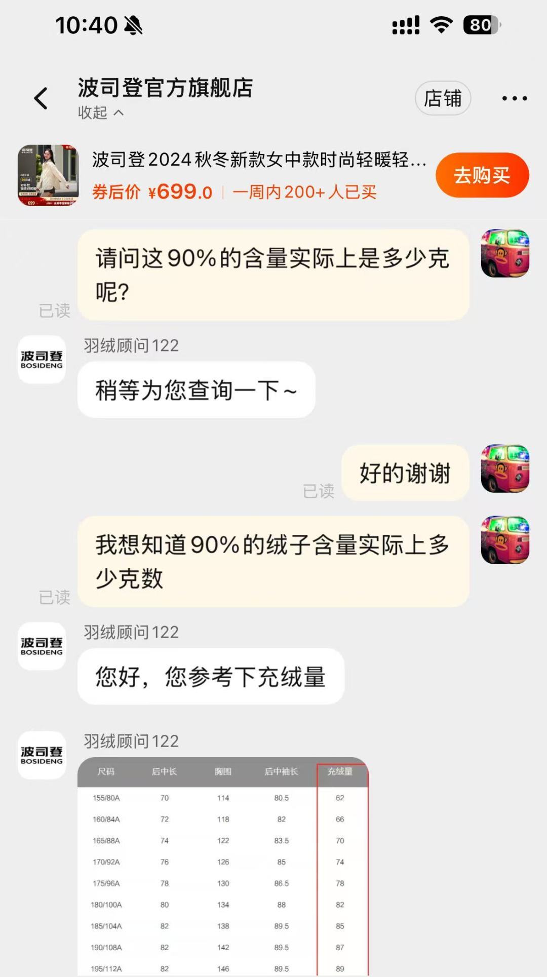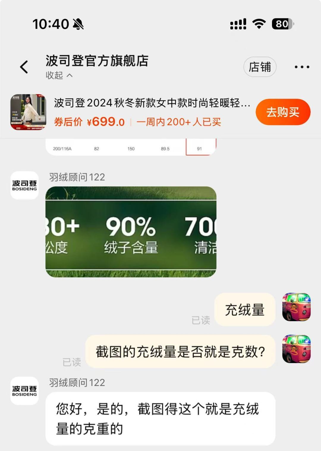12月26日,记者在波司登淘宝官方旗舰店搜索发现,此前引发热议的羽绒裤款已下架,目前在售的成人款羽绒裤优惠券后售价在300元-1200元的区间。其中,券后售价1137元的“冬季男士时尚鹅绒运动双板滑雪羽绒裤”,充绒量按照羽绒裤码数递增为50克至64克。记者选取了一款2024秋季中款轻暖羽绒服咨询客服,产品宣称的90%绒子含量实际上是多少克数,客服给出一份截图回复称“充绒量的克数可参考图表。”