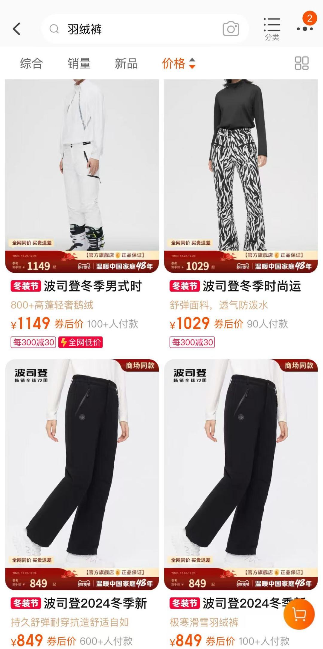 (波司登线上与商场同款价格在800-1100元的羽绒裤仍在热卖。)