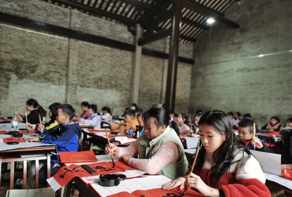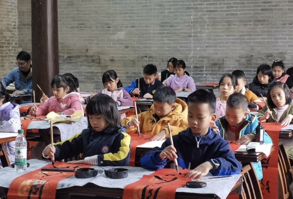 “‘天’字第一笔,这个‘横’,起笔的时候稍微停顿一下,然后向右行笔,收笔的时候也要有力(度)。”“最后一笔‘捺’,到末端的时候稍微停顿一下,再轻轻提起。”记者近日获悉,今年3月起,每逢周日上午,广州市番禺区大龙街旧水坑村陈尚书祠内弥漫着浓浓的墨香,阵阵清脆的讲解声传出,孩子们全神贯注地聆听老师对每一个笔画的细致剖析,眼神中充满着对书法艺术的热爱与坚持。