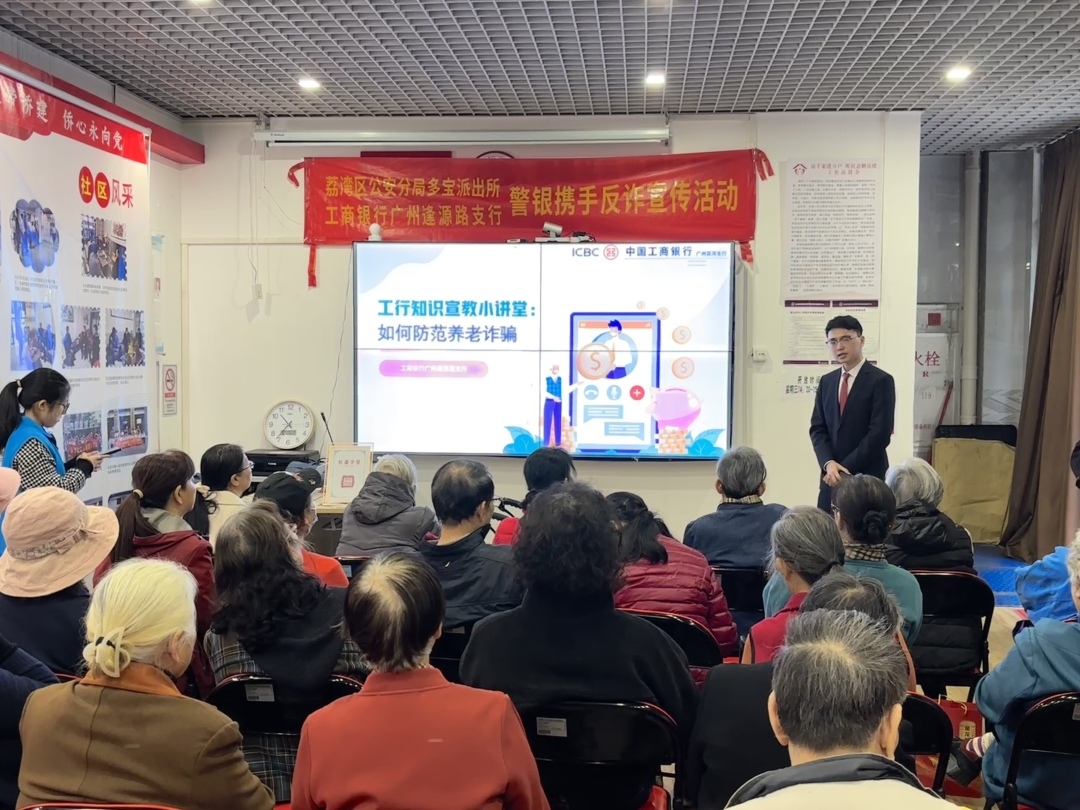 工商银行广州逢源路支行作为工行系统内首家“全国示范性老年友好型社区联建网点”,近年来始终致力于为老年客户提供更加贴心、更加专业的服务。据介绍,12月26日,工行逢源路支行联合广州市公安局荔湾分局多宝派出所在荔湾区御景社区向三十余名老年社区居民讲授反诈课程。活动现场,工行逢源路支行工作人员与多宝派出所的民警共同为老年居民带来了一场内容丰富、形式多样的反诈课程,课程内容涵盖了电信诈骗的常见类型、防范技巧以及如何识别诈骗电话和短信等实用知识。通过案例分析、情景模拟和互动问答等形式,让老年居民们在轻松愉快的氛围中学到了反诈知识,增强了自我保护意识和能力;通过反诈宣传活动,让银发客群能够更加警觉,避免成为诈骗的受害者。
