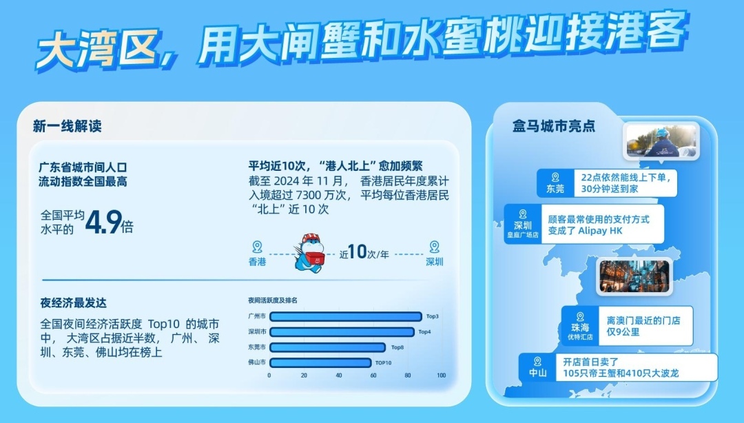 其中水果、水产等时令食品是港人的心头好。盒马统计显示,当阳山水蜜桃、阳澄湖大闸蟹等特色时令生鲜上市时,距离福田口岸最近的盒马深圳皇庭广场店都会迎来“跨境尝鲜”的人潮,使用Alipay HK的用户超过了其他方式的总和。随着年关将近,港人买年货的需求升高。中山、珠海以及即将开业的东莞盒马鲜生,正助推这波“北上”消费的热潮。
