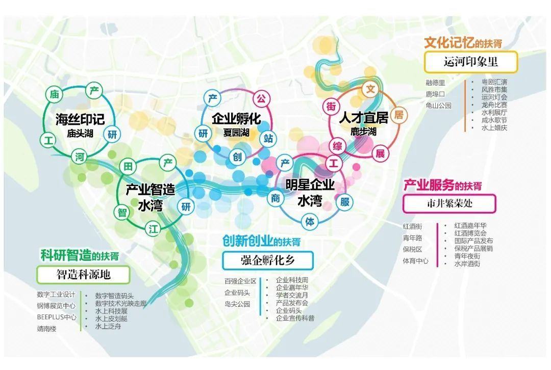 六节点:水乡文化里、水岸技艺街、科技大观园、企业创业墟、田园科技坊、数字智造舟