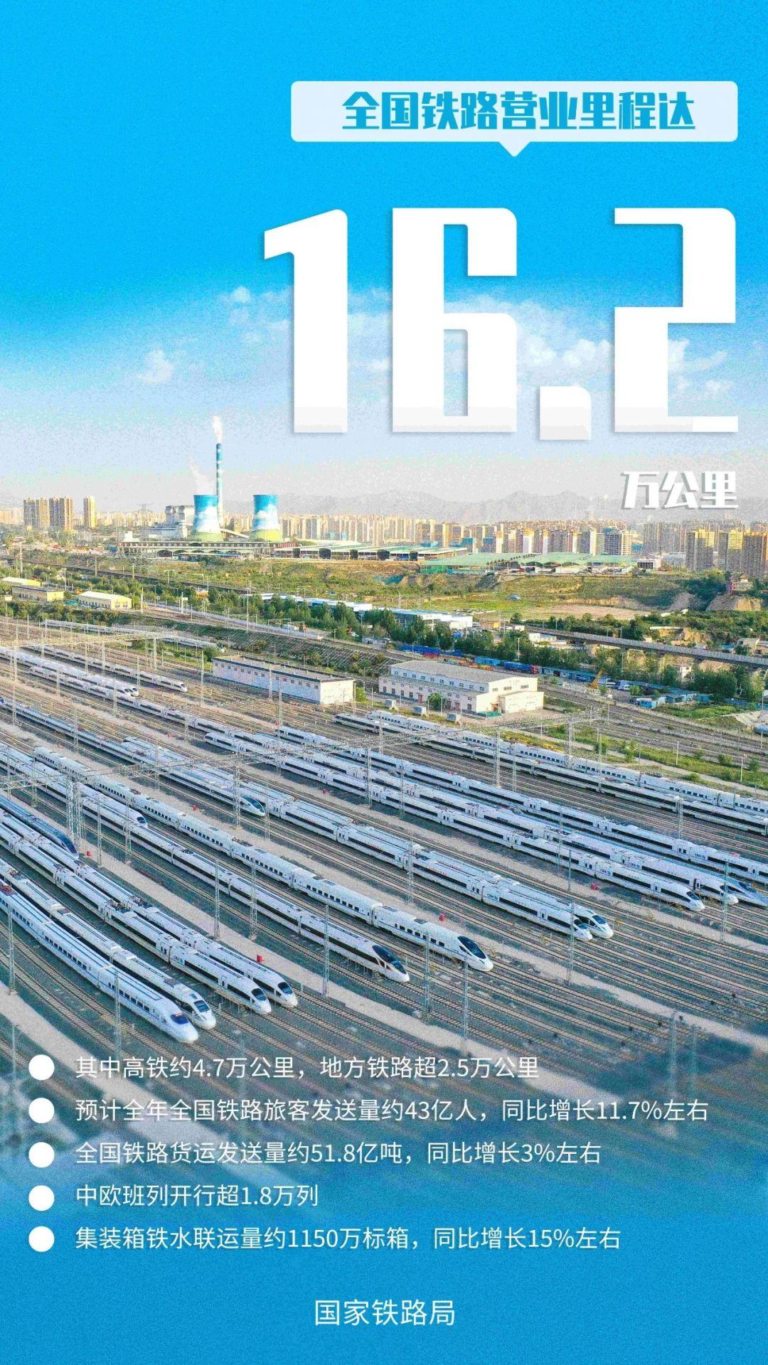12月26日,2025年全国铁路监督管理工作会议在京召开。会议指出,预计2024年全年全国铁路固定资产投资完成超8000亿元,投产新线约3000公里,其中高铁约2300公里;全国铁路营业里程约16.2万公里,其中高铁约4.7万公里,地方铁路超2.5万公里;预计全年全国铁路旅客发送量约43亿人,同比增长11.7%左右;全国铁路货运发送量约51.8亿吨,同比增长3%左右;中欧班列开行超1.8万列,通达36个国家的320余个城市;集装箱铁水联运量约1150万标箱,同比增长15%左右。