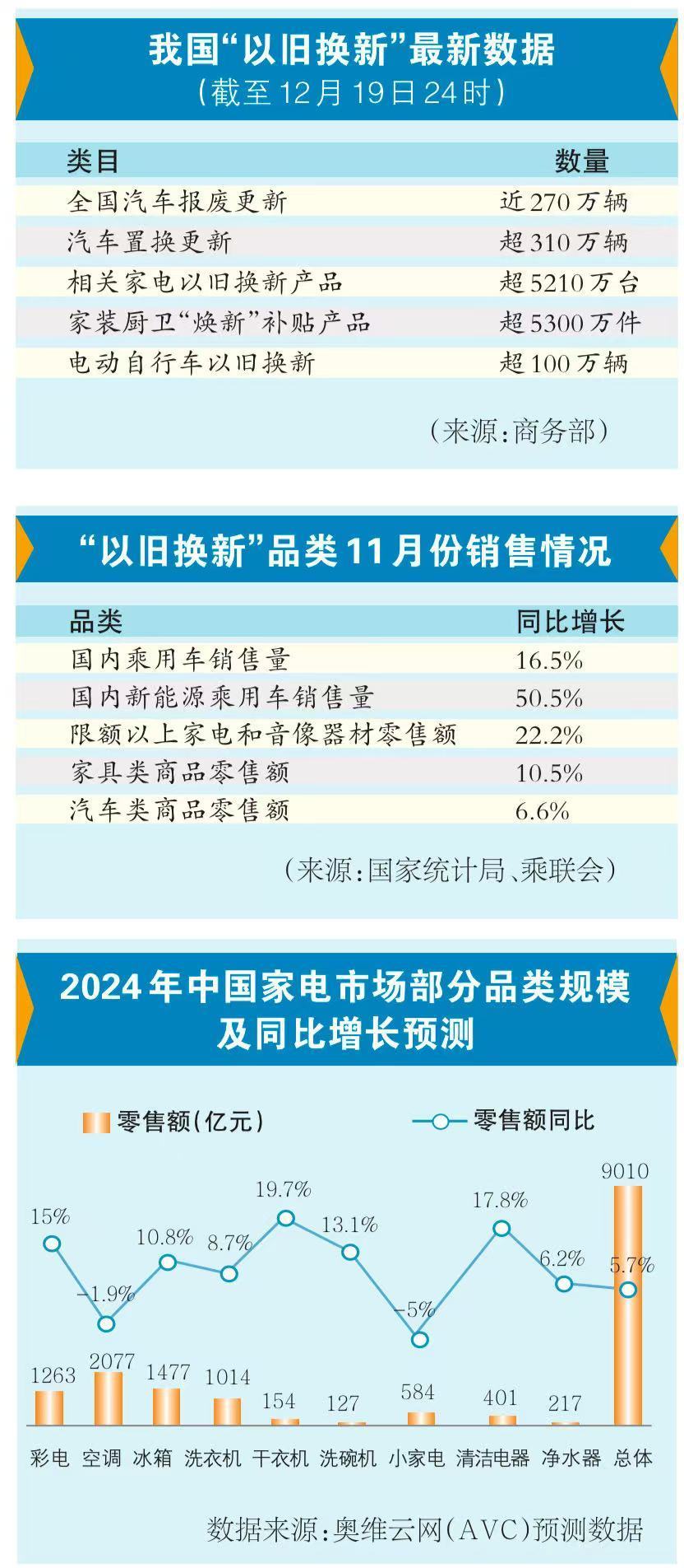 “你以旧换新了吗?”消费品以旧换新政策,无疑是2024年各地消费市场的一大亮点,显现出良好的拉动效果——商务部12月中旬发布的数据显示,今年以来,消费品以旧换新政策整体带动相关产品销售额超1万亿元。