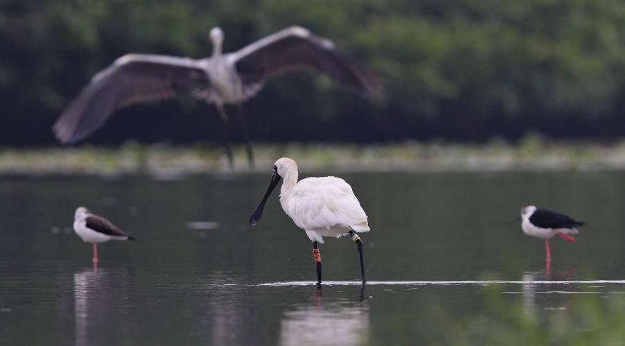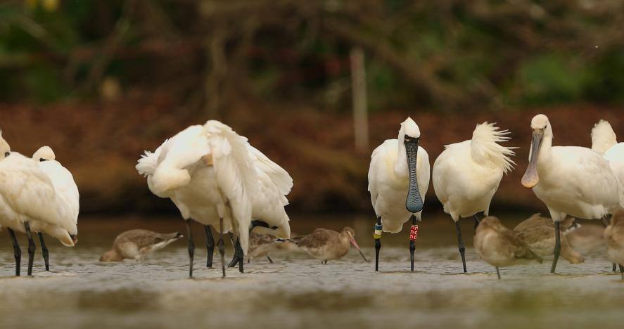 近日,资深摄影爱好者刘文华在南沙湿地再次拍摄到戴脚环“E66”的黑脸琵鹭。这已是刘文华继2022年、2023年后,第三次与这只珍稀候鸟相遇。