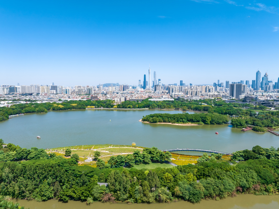 海珠湖公园恰好与广州塔、体育中心呈一直线,湖区、果园组成了广州市中轴线南端的“生态绿轴”,成为名副其实的广州“绿心”。