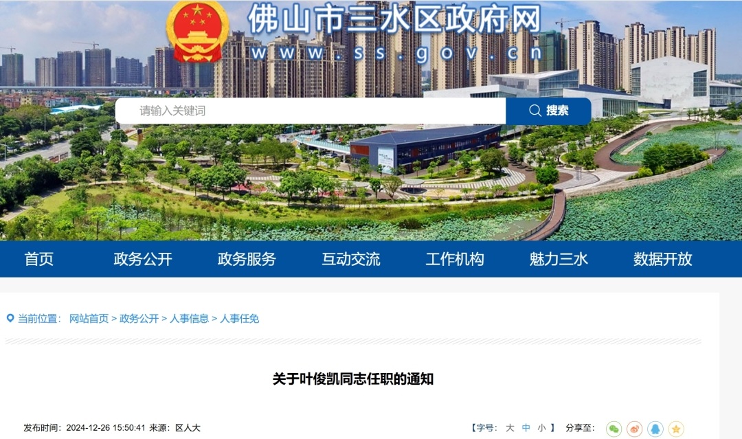 根据通知,佛山市三水区第十七届人民代表大会常务委员会第三十七次会议于2024年12月26日通过,决定任命:叶俊凯同志为佛山市三水区文化广电旅游体育局局长。