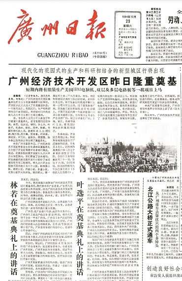 1984年12月29日,广州日报头版报道广州经济技术开发区奠基。(广州日报资料图)